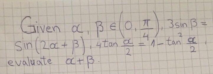 Since  \small 3sin\beta =sin(2\alpha +\beta )=sin(\alpha +\beta )cos\alpha +cos(\alpha +\beta )sin\alpha     (1)